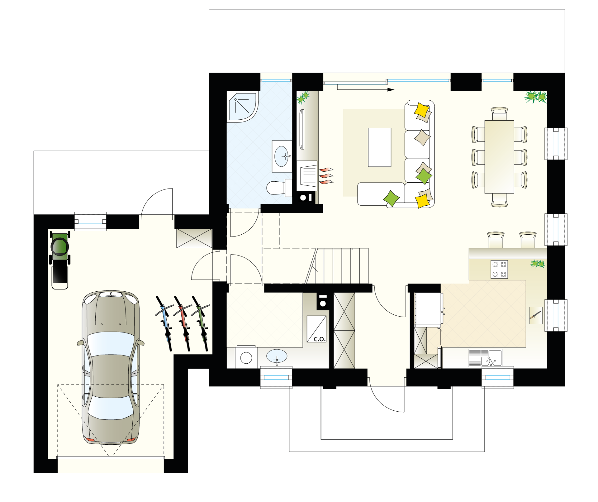 Dom z dużym garażem poza tym, że pełni funkcje typowe dla budynku mieszkalnego, umożliwia zabezpieczenie samochodu. Nic dziwnego, że na taką opcję chętnie decydują się właściciele luksusowych samochodów czy innych kosztownych pojazdów. Wysoki poziom bezpieczeństwa to tylko jedna z wielu zalet, jaką może poszczycić się garaż. Kolejnym praktycznym aspektem jest wyjątkowa wygoda. Parkując w garażu, nie musisz przejmować się tym, jaka pogoda panuje na zewnątrz. Bez względu na to, czy na dworze jest mróz, deszcz, czy też nieznośny upał, zawsze możesz przejść do domu nie narażając się na niesprzyjające czynniki zewnętrzne. W garażu połączonym z domem przez cały rok panuje optymalna temperatura, co zwiększa wygodę jego użytkowania. Dla przykładu, w okresie zimowym na szybach nie gromadzi się szron, co niweluje konieczność ich czasochłonnego skrobania. Z kolei latem samochód znajdujący się w garażu nie nagrzewa się nadmiernie, co również korzystnie wpływa na komfort jego użytkowania. Biorąc pod uwagę te czynniki, nie dziwi fakt, że projekty domów z garażem cieszą się obecnie dużym powodzeniem. Domy, które powstały na bazie naszych planów gwarantują doskonałą komunikację pomiędzy pomieszczeniami. W związku z tym nie będziesz miał żadnego problemu, aby na przykład przejść z części mieszkalnej do swojego samochodu bez wychodzenia na zewnątrz. Docenisz to na przykład w zimie albo w sytuacji, gdy na dworze pada deszcz. W projektach domów z dużymi garażami uwzględniliśmy wykorzystanie najlepszych materiałów budowlanych. Dzięki temu masz gwarancję, że Twój samochód będzie maksymalnie zabezpieczony.